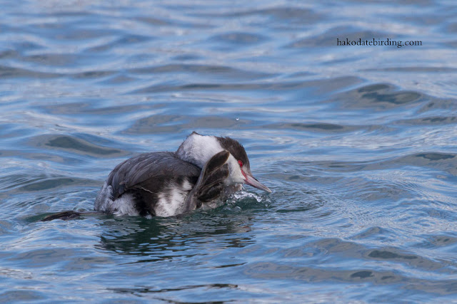 In the afternoon I was in Kamiiso, there were 3 species of grebe in the harbour again. Half a dozen each of Black Necked and Great Crested (above) and the lone Slavonian from a few days ago was still around.